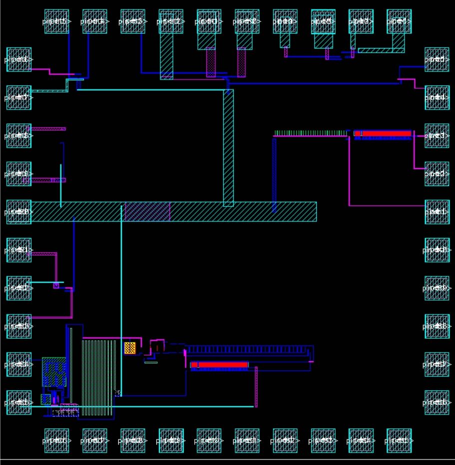 Now for the actual chip itself, we used the pad and padframe that we created in Tutorial 6 in order to set it up. The schematic simply has all of the components with appropriate pins assigned and the layout simply shows each component placed relatively close to the pins that it utilizes, with metal layers to attach the component to either its corresponding pins or the common ground (pin 20).