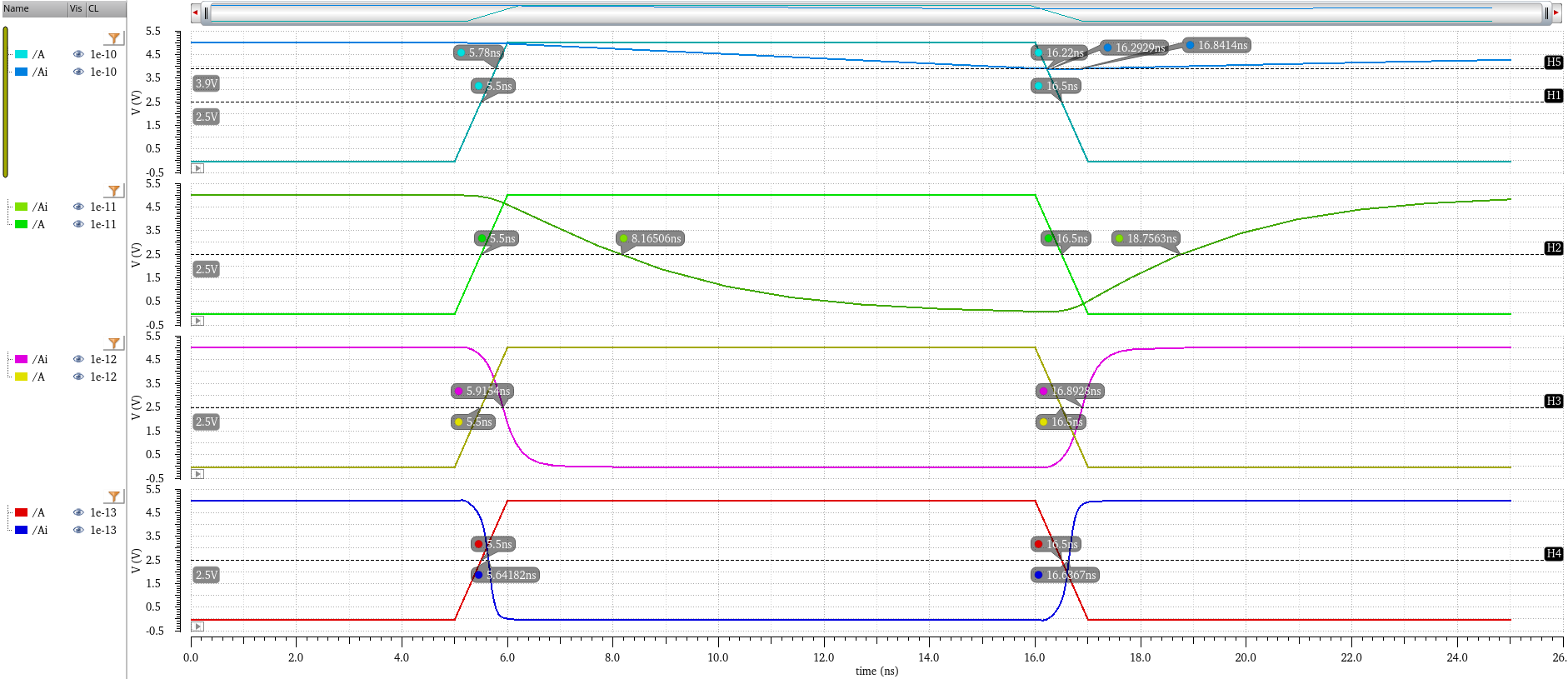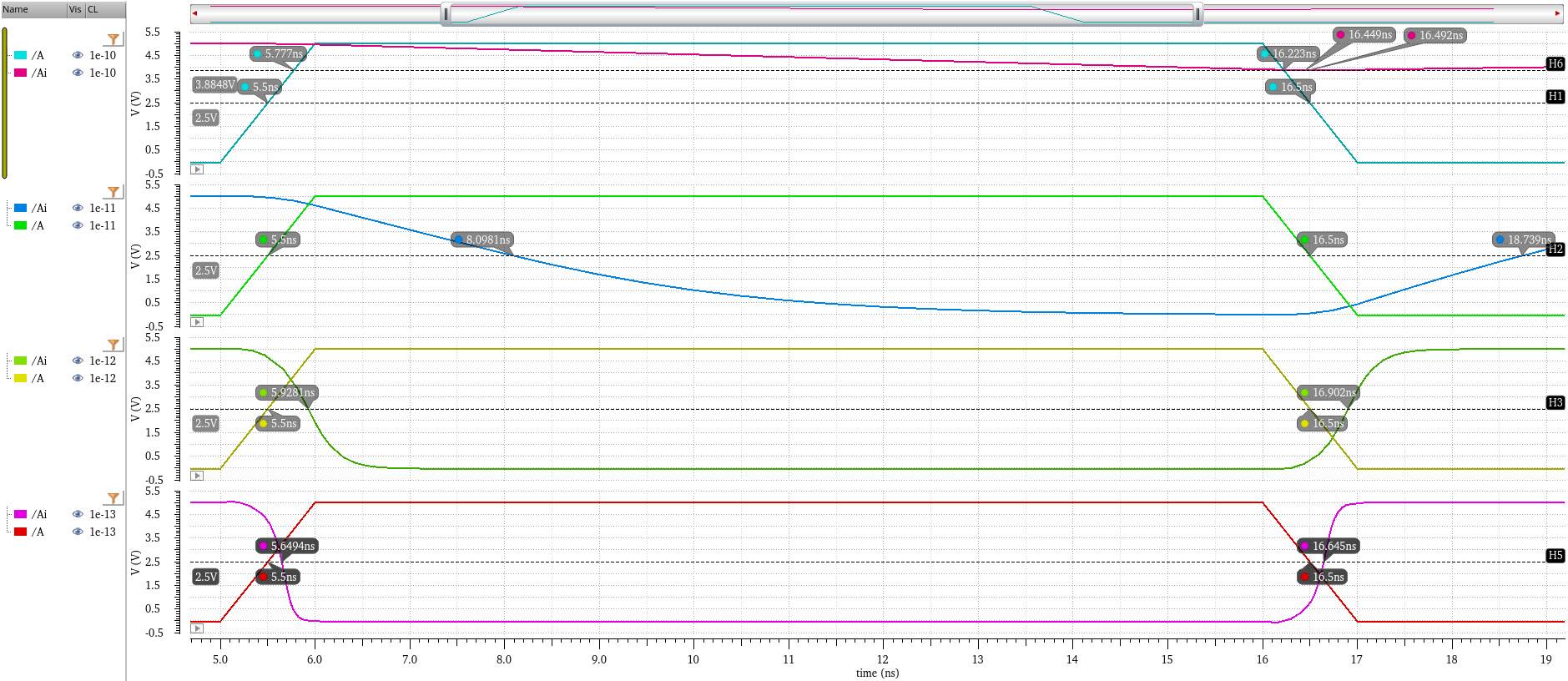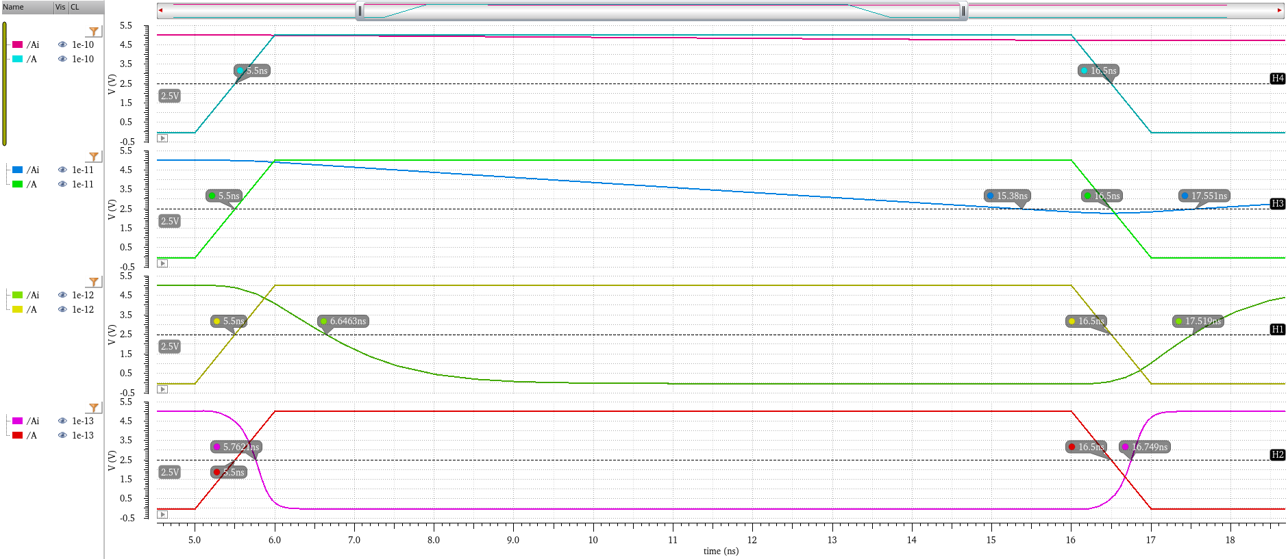 to do the same for higher capacitance loads. I used a marker at 2.5V (VDD/2) to judge the delay for each case.