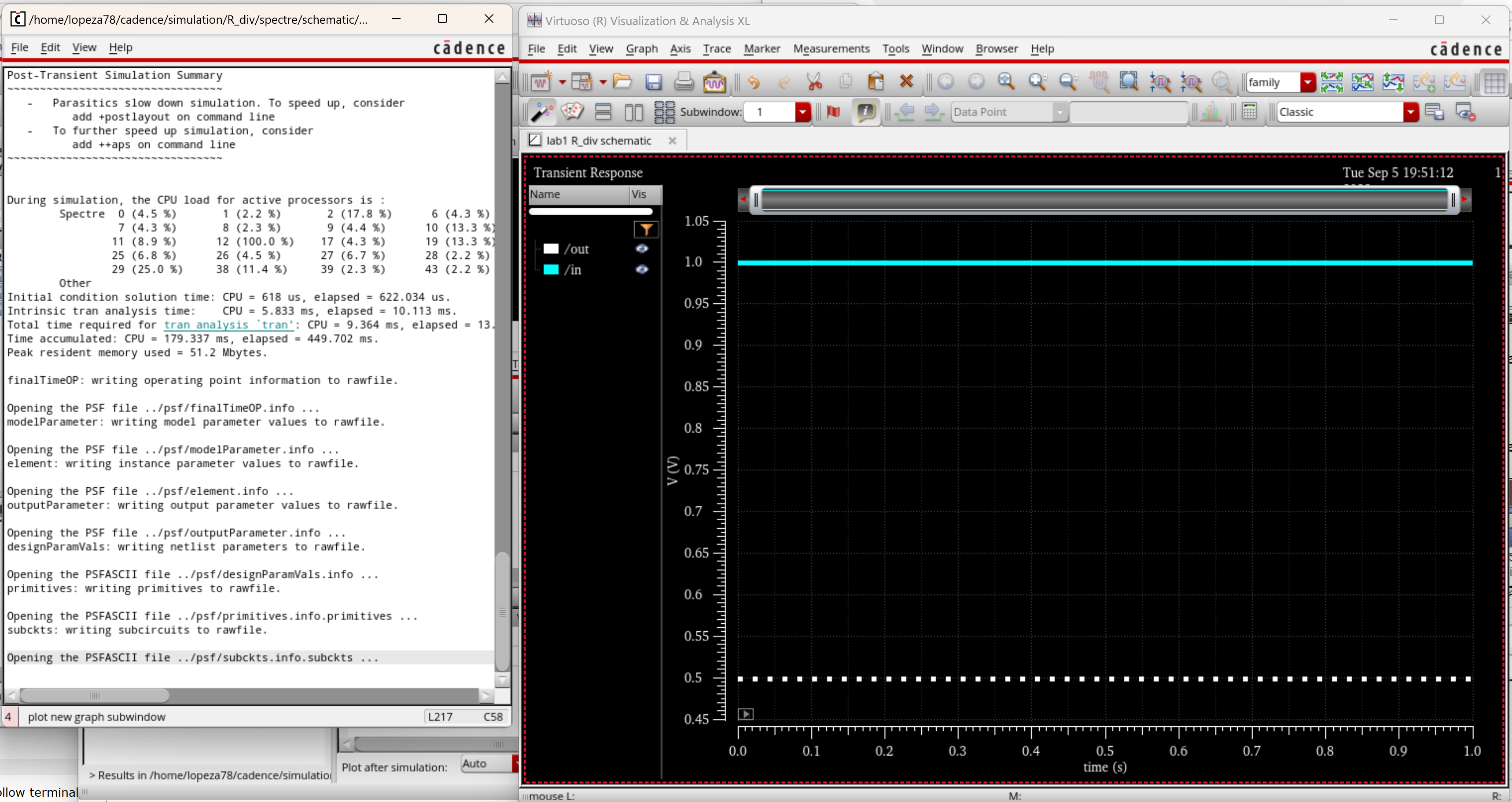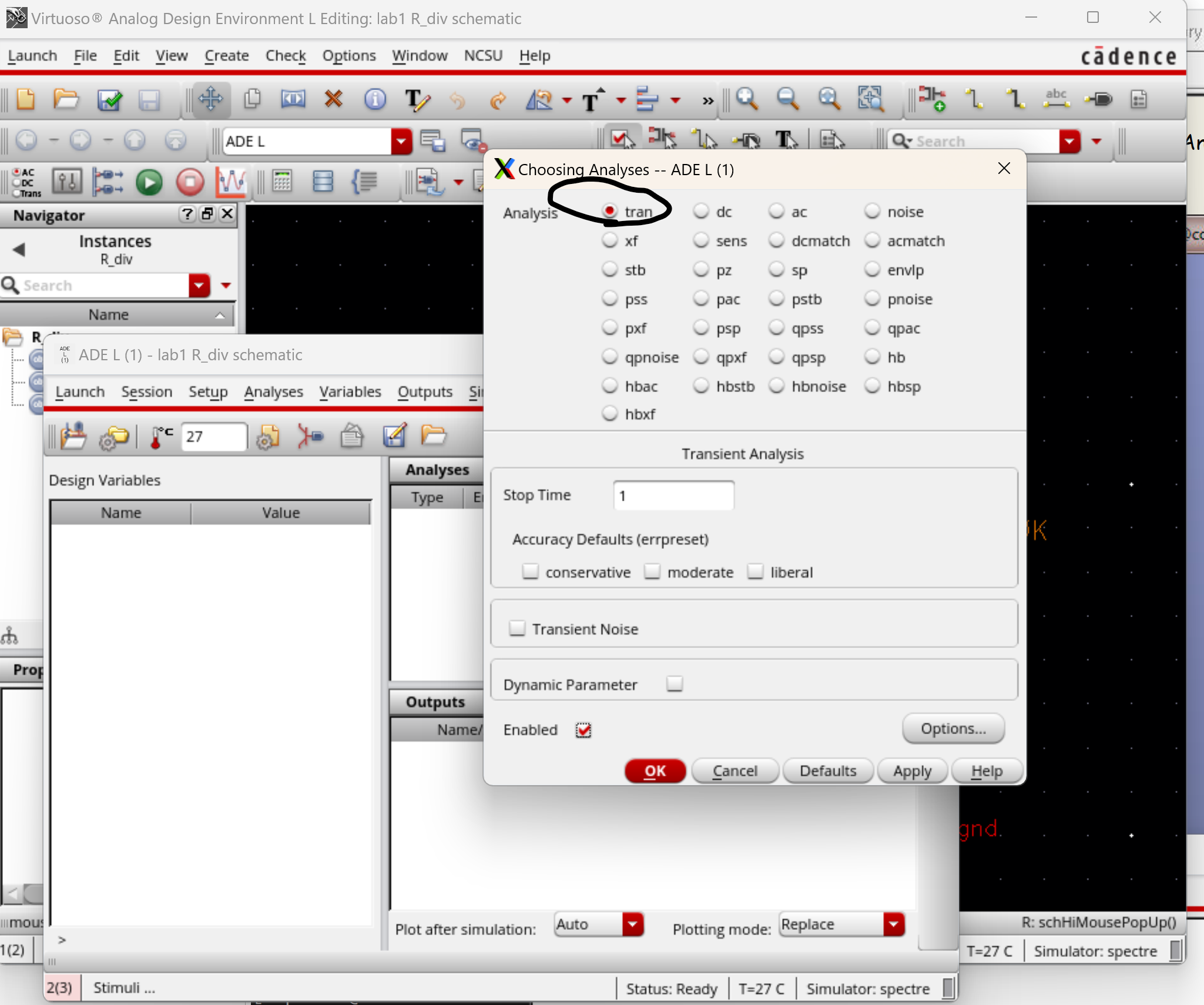 - Here we have our selection of a tran simulation from the spectre simulator.