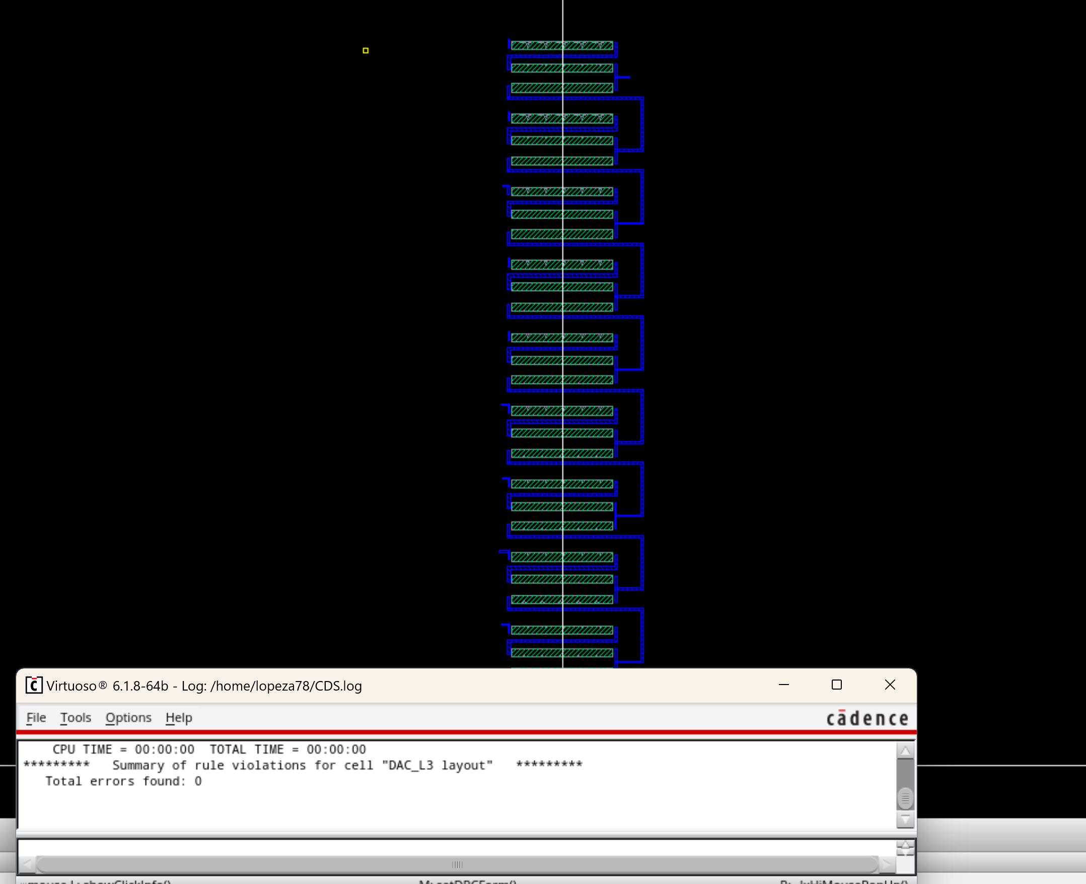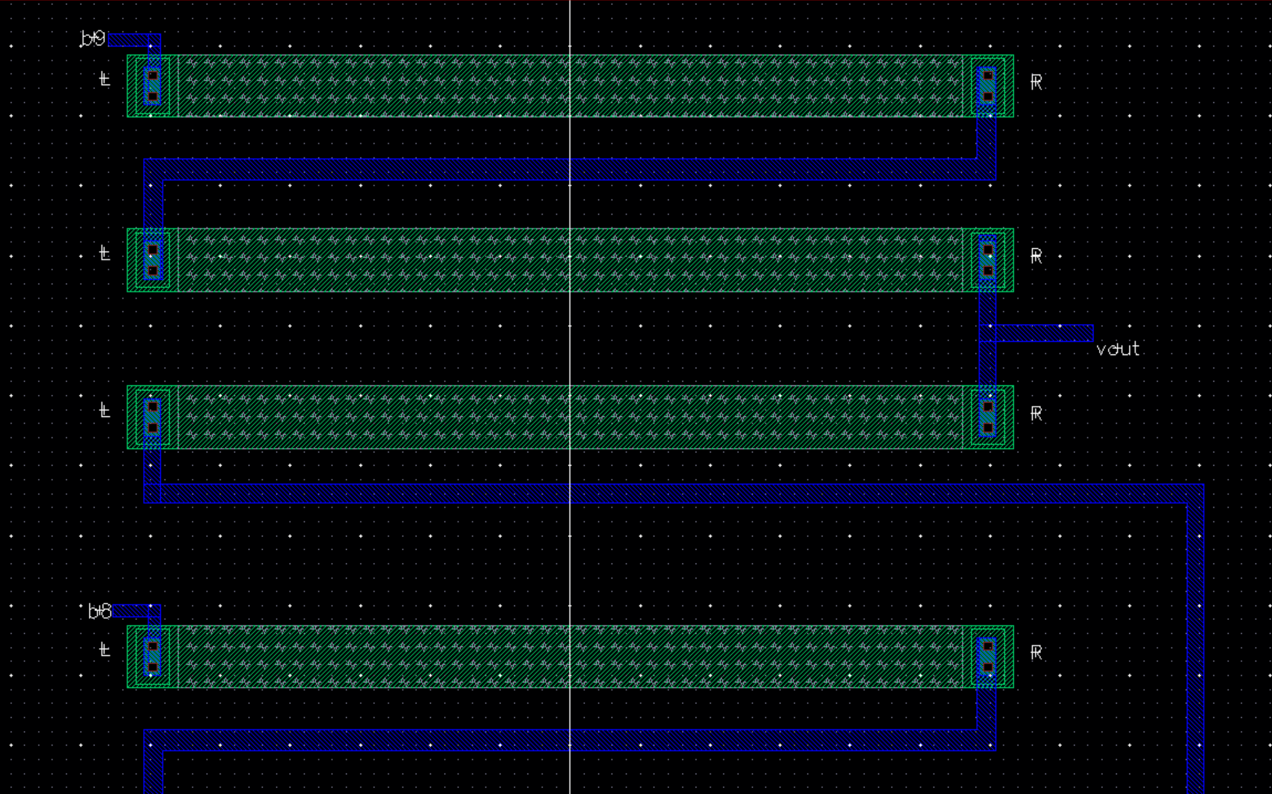 the voltage divieder layout to create a 10 bit DAC. Then verifying our