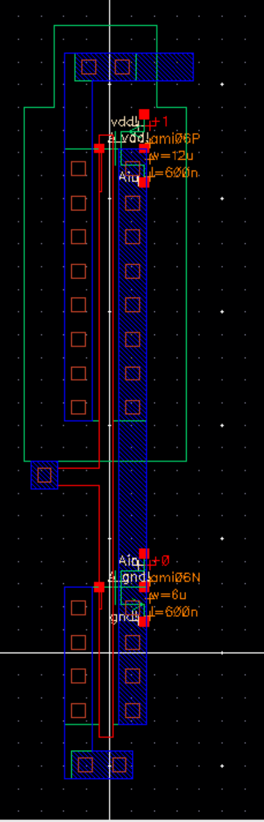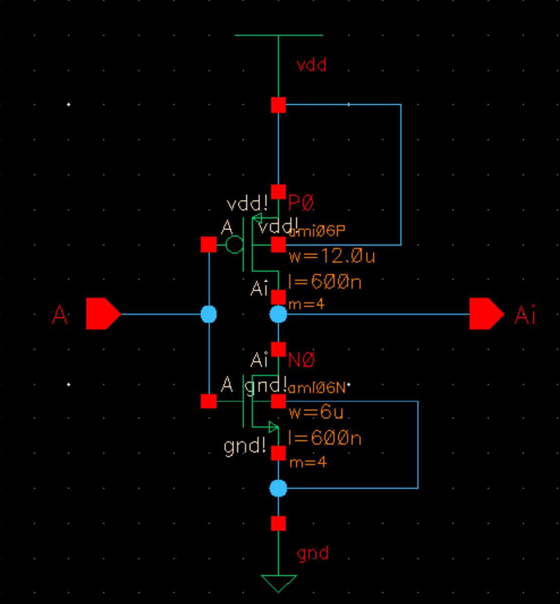 - Draft schematics, layouts, and symbols for two inverters having sizes of: