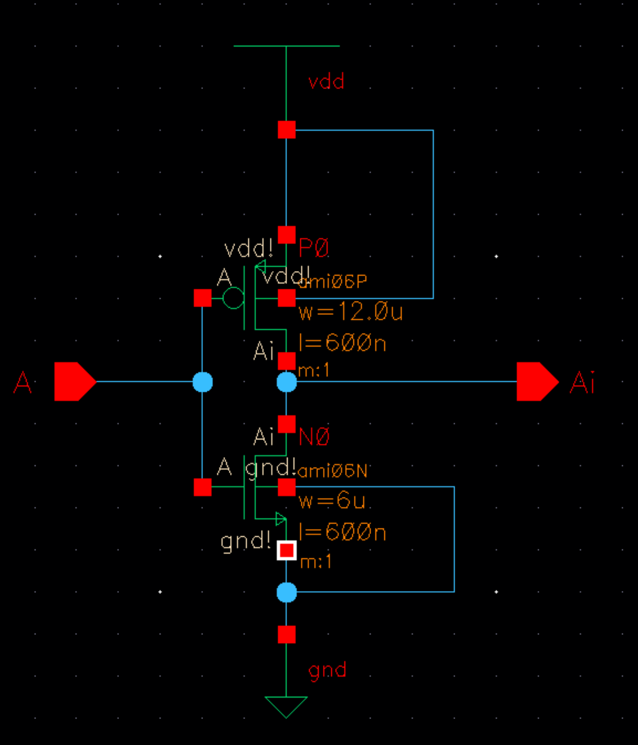 - 12u/6u (= width of the PMOS / width of the NMOS with both devices having minimum lengths of 0.6u)