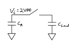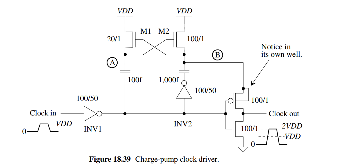 Output Stage: The final part of the circuit includes another inverter. When the input to this inverter is high, the gate of the PMOS transistor opens, allowing it to handle the larger current coming from the C1 capacitor. Conversely, when the input is low, the PMOS transistor is switched off, and the NMOS transistor instead pulls the output down to GND. This design ensures that the output alternates between 0 and 2VDD, matching the clock signal's oscillation.