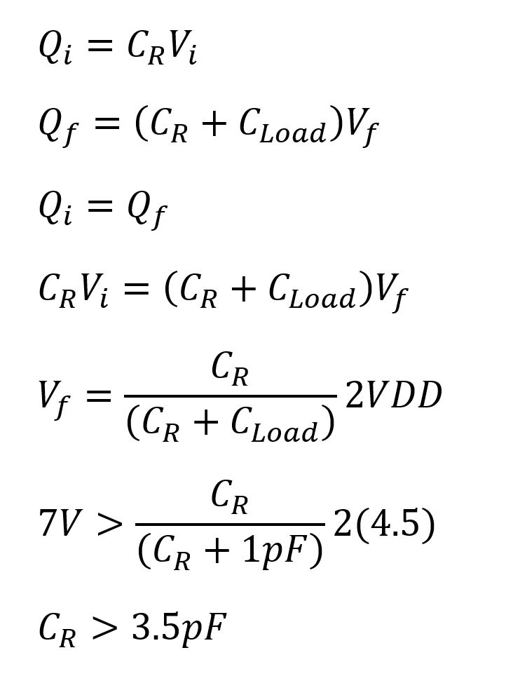 Input and Clock Signal: In this circuit, our clock signal oscillates between 0 and 1. Early in the circuit, there are two inverters that produce complementary clock signals, which are out of phase with each other. This means when the input VDD is high (4.5-5.5V), the first inverter (INV1) outputs a low signal, and when the input is low it outputs a high signal. When the input is 0, it's inverted to 1 (equivalent to VDD), which charges the smaller 100fF capacitor, well call it C0. This charged capacitor then activates a M2, which in turn charges the larger 1pF capacitor, called C1.