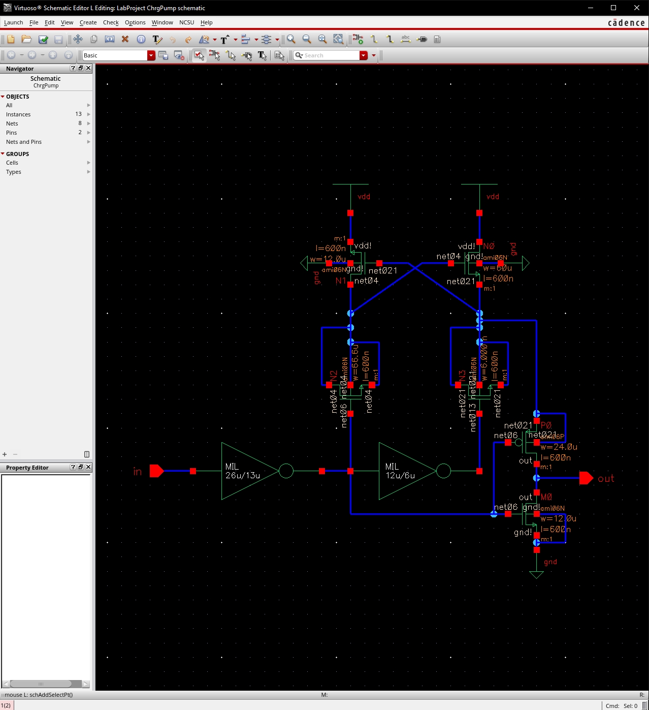 down to use a 26.1/13.05 inverter so that on the layout I can use 8.7µ m=3 and 4.35µ m=3.