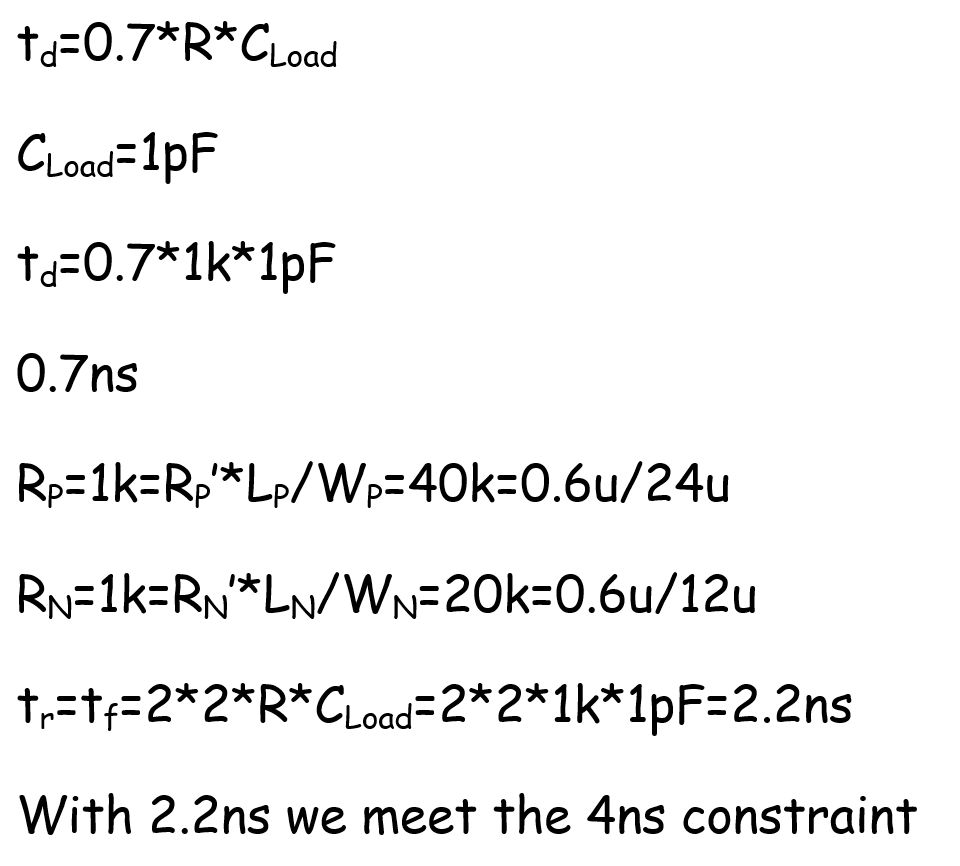 For setting our TPHL and TPLH the same we can substitute Wp = 2Wn. We also know that in the C5 process C’OX = 2.5fF/µ2 and using the minimum lengths we will use Ln=Lp=0.6µm.