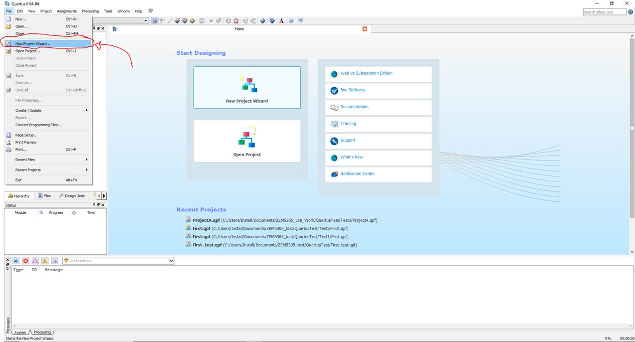 Launching the Quartus 13.1 application, go to File